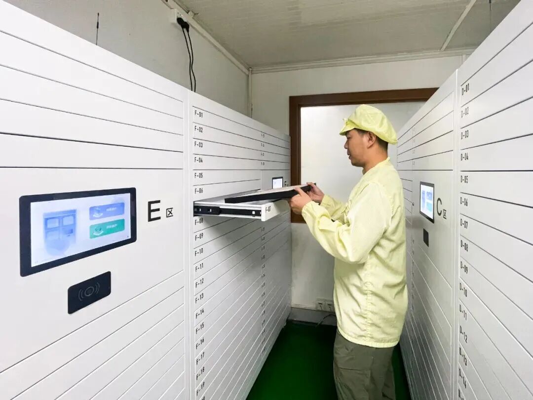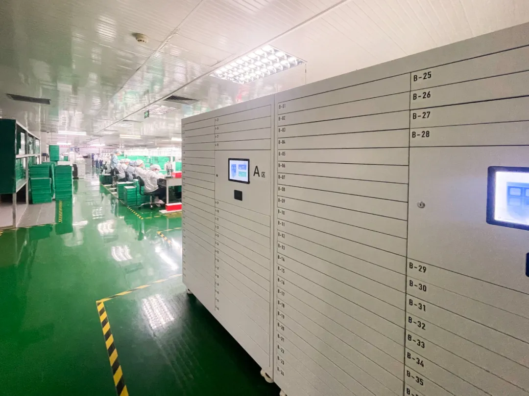 小铁智能储物柜,通过刷卡开柜的鉴权方式,实现员工自助存取无尘服和鞋子,系统自动记录领取信息并实时同步至SaaS系统,管理人员可随时随地掌握库存动态。