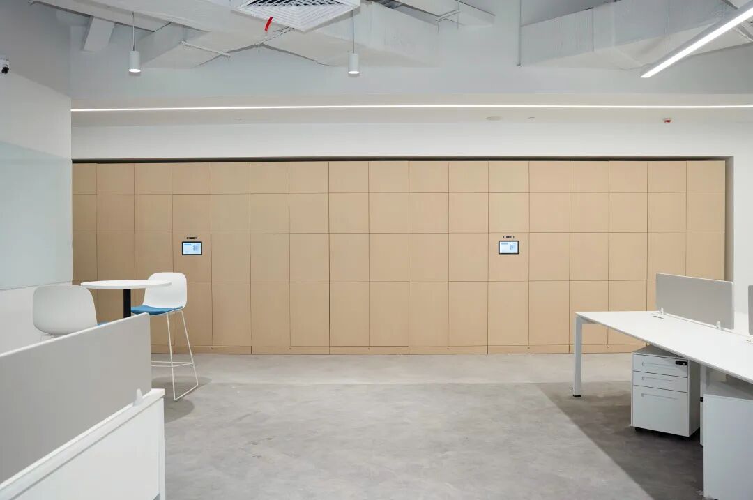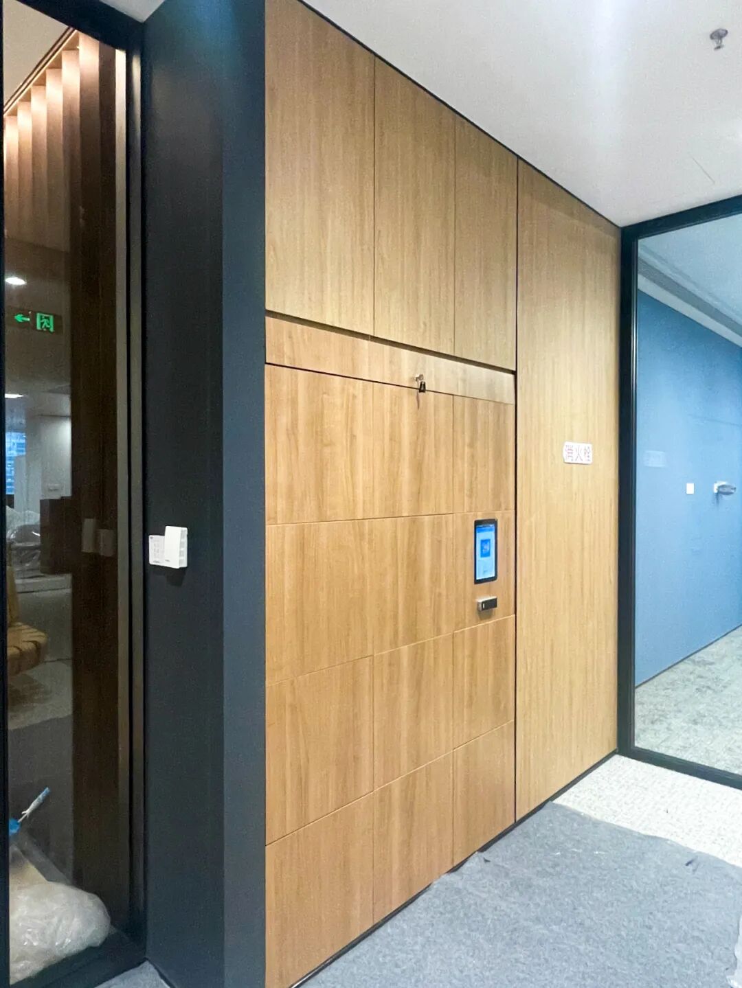 上海思科研发中心的新办公区以黑白灰简约风为主,小铁为其定制的原木色智能储物柜,不仅与整体装修风格高度契合,更通过垂直收纳的设计,进一步拓展了储物容量。